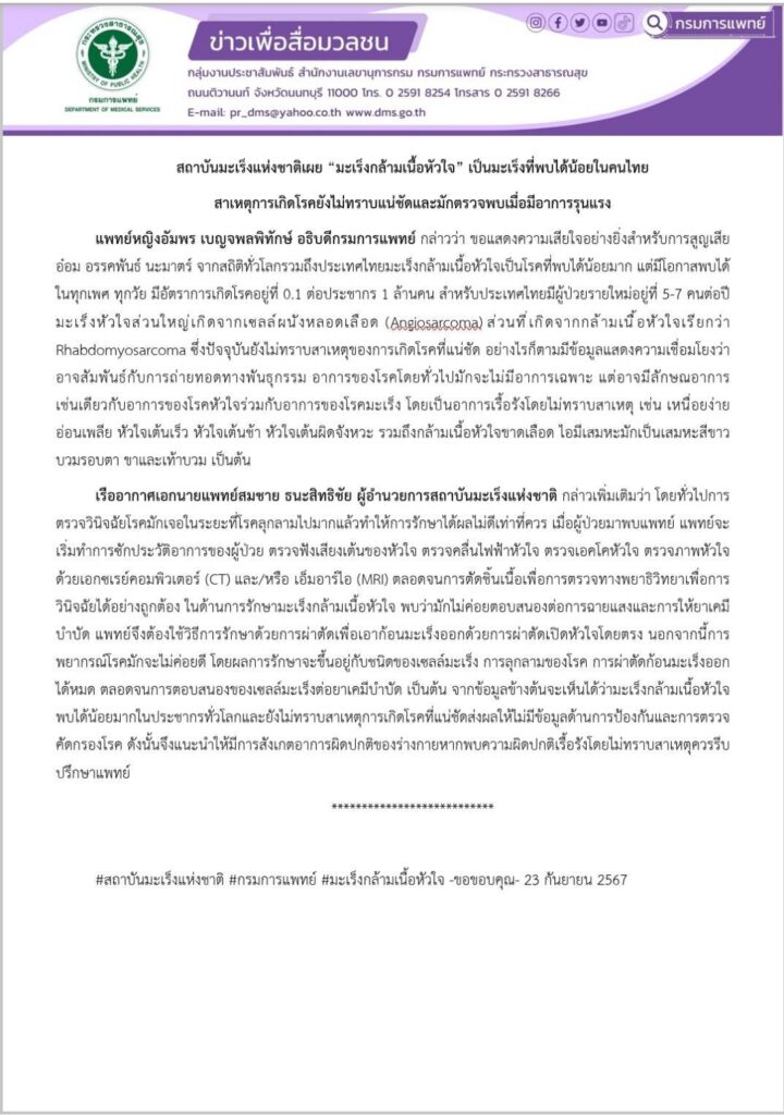 ซึ่งปัจจุบันยังไม่ทราบสาเหตุของการเกิดโรคที่แน่ชัด อย่างไรก็ตามมีข้อมูลแสดงความเชื่อมโยงว่าอาจสัมพันธ์กับการถ่ายทอดทางพันธุกรรม อาการของโรคโดยทั่วไปมักจะไม่มีอาการเฉพาะ แต่อาจมีลักษณอาการเช่นเดียวกับอาการของโรคหัวใจร่วมกับอาการของโรคมะเร็ง โดยเป็นอาการเรื้อรังโดยไม่ทราบสาเหตุ เช่น เหนื่อยง่าย อ่อนเพลีย หัวใจเต้นเร็ว หัวใจเต้นช้า หัวใจเต้นผิดจังหวะ รวมถึงกล้ามเนื้อหัวใจขาดเลือด ไอมีเสมหะมักเป็นเสมหะสีขาว บวมรอบตา ขาและเท้าบวม เป็นต้นเรืออากาศเอกนายแพทย์สมชาย ธนะสิทธิชัย ผู้อำนวยการสถาบันมะเร็งแห่งชาติ กล่าวเพิ่มเติมว่า โดยทั่วไปการตรวจวินิจฉัยโรคมักเจอในระยะที่โรคลุกลามไปมากแล้วทำให้การรักษาได้ผลไม่ดีเท่าที่ควร เมื่อผู้ป่วยมาพบแพทย์ แพทย์จะเริ่มทำการซักประวัติอาการของผู้ป่วย ตรวจฟังเสียงเต้นของหัวใจ ตรวจคลื่นไฟฟ้าหัวใจ ตรวจเอคโคหัวใจ ตรวจภาพหัวใจด้วยเอกซเรย์คอมพิวเตอร์ (CT) และ/หรือ เอ็มอาร์ไอ (MRI) ตลอดจนการตัดชิ้นเนื้อเพื่อการตรวจทางพยาธิวิทยาเพื่อการวินิจฉัยได้อย่างถูกต้อง ในด้านการรักษามะเร็งกล้ามเนื้อหัวใจ พบว่ามักไม่ค่อยตอบสนองต่อการฉายแสงและการให้ยาเคมีบำบัด แพทย์จึงต้องใช้วิธีการรักษาด้วยการผ่าตัดเพื่อเอาก้อนมะเร็งออกด้วยการผ่าตัดเปิดหัวใจโดยตรง นอกจากนี้การพยากรณ์โรคมักจะไม่ค่อยดี โดยผลการรักษาจะขึ้นอยู่กับชนิดของเซลล์มะเร็ง การลุกลามของโรค การผ่าตัดก้อนมะเร็งออกได้หมด ตลอดจนการตอบสนองของเซลล์มะเร็งต่อยาเคมีบำบัด เป็นต้น จากข้อมูลข้างต้นจะเห็นได้ว่ามะเร็งกล้ามเนื้อหัวใจพบได้น้อยมากในประชากรทั่วโลกและยังไม่ทราบสาเหตุการเกิดโรคที่แน่ชัดส่งผลให้ไม่มีข้อมูลด้านการป้องกันและการตรวจคัดกรองโรค ดังนั้นจึงแนะนำให้มีการสังเกตอาการผิดปกติของร่างกายหากพบความผิดปกติเรื้อรังโดยไม่ทราบสาเหตุควรรีบปรึกษาแพทย์***************************#สถาบันมะเร็งแห่งชาติ #กรมการแพทย์ #มะเร็งกล้ามเนื้อหัวใจ -ขอขอบคุณ- 23 กันยายน 2567