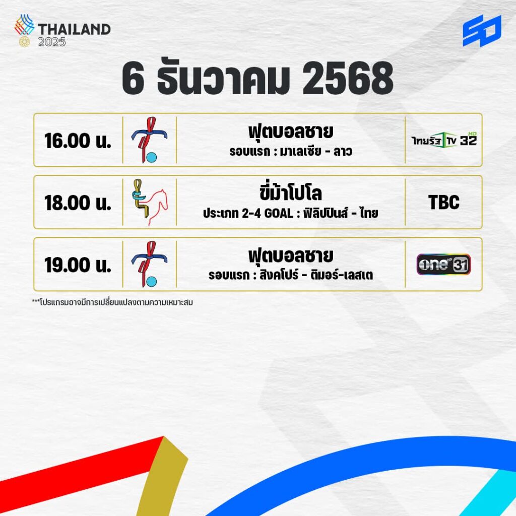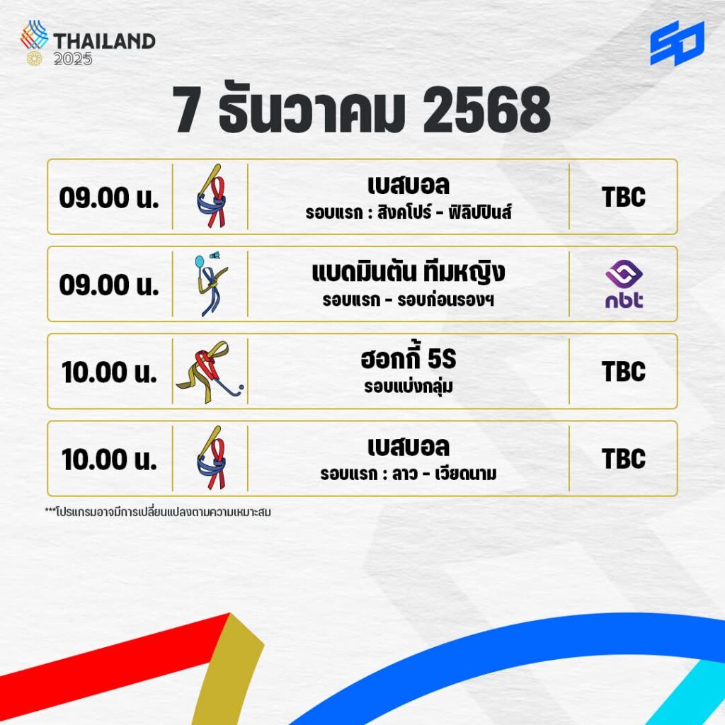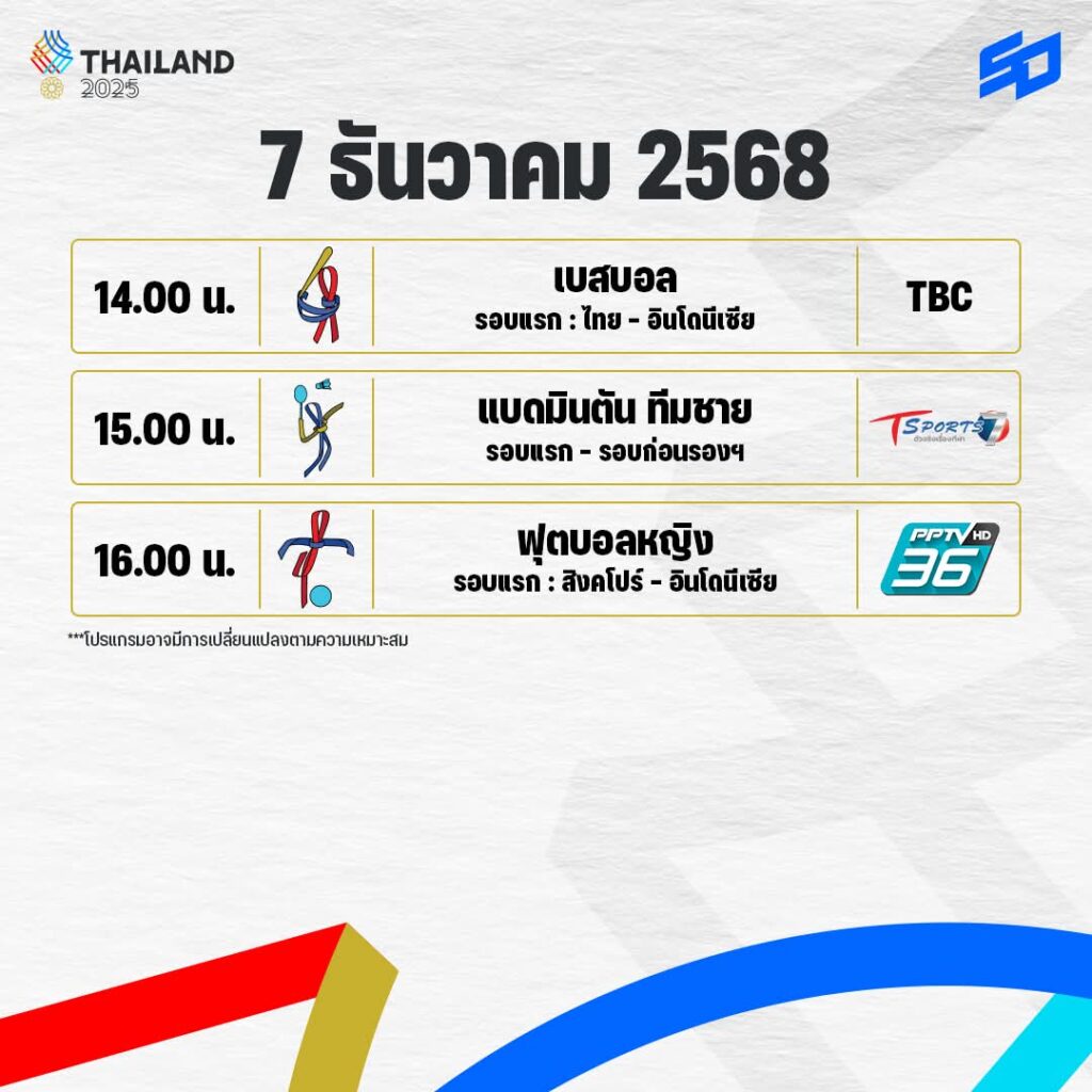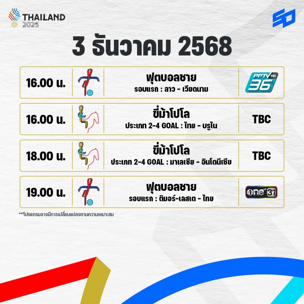 โปรแกรมการแข่งขัน และโปรแกรมถ่ายทอดสดซีเกมส์ 2025 วันที่ 3-9 ธ.ค. 2025ถ่ายทอดสดทาง PPTV 36, ไทยรัฐทีวี 32, ONE 31, T Sports 7, NBT และ TrueVisions NOW***โปรแกรมอาจมีการเปลี่ยนแปลงตามความเหมาะสมมหกรรมกีฬาซีเกมส์ ครั้งที่ 33 ไทยแลนด์ 20259-20 ธันวาคม 2568 ที่ กรุงเทพฯ และ ชลบุรี#StadiumTH #THAIteamชนะใจคนไทย #นักกีฬาทีมชาติไทย #ทีมชาติไทย #เชียร์ไทยในบ้านเรา #SEAGAMES2025 #ซีเกมส์ #HomeofTHAITeam #HomeofSEAGAMES